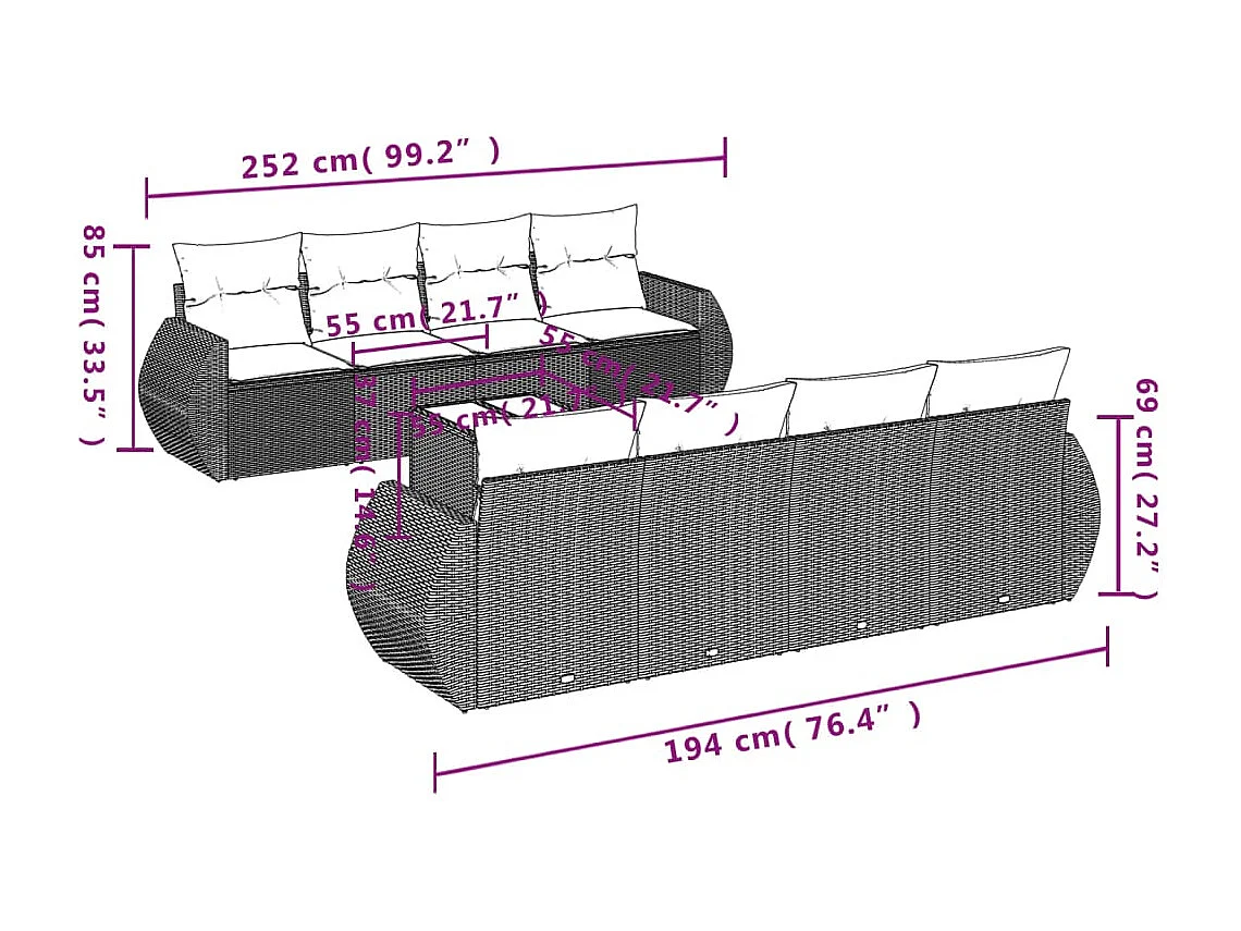 Salon de jardin 9 pcs avec coussins gris résine tressée