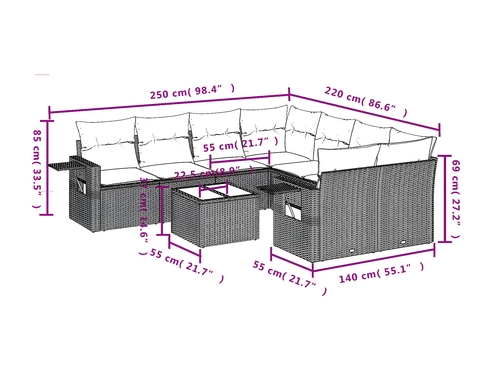 Salon de jardin 9 pcs avec coussins noir résine tressée