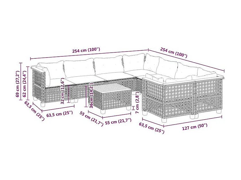 Salon de jardin 9 pcs avec coussins noir résine tressée