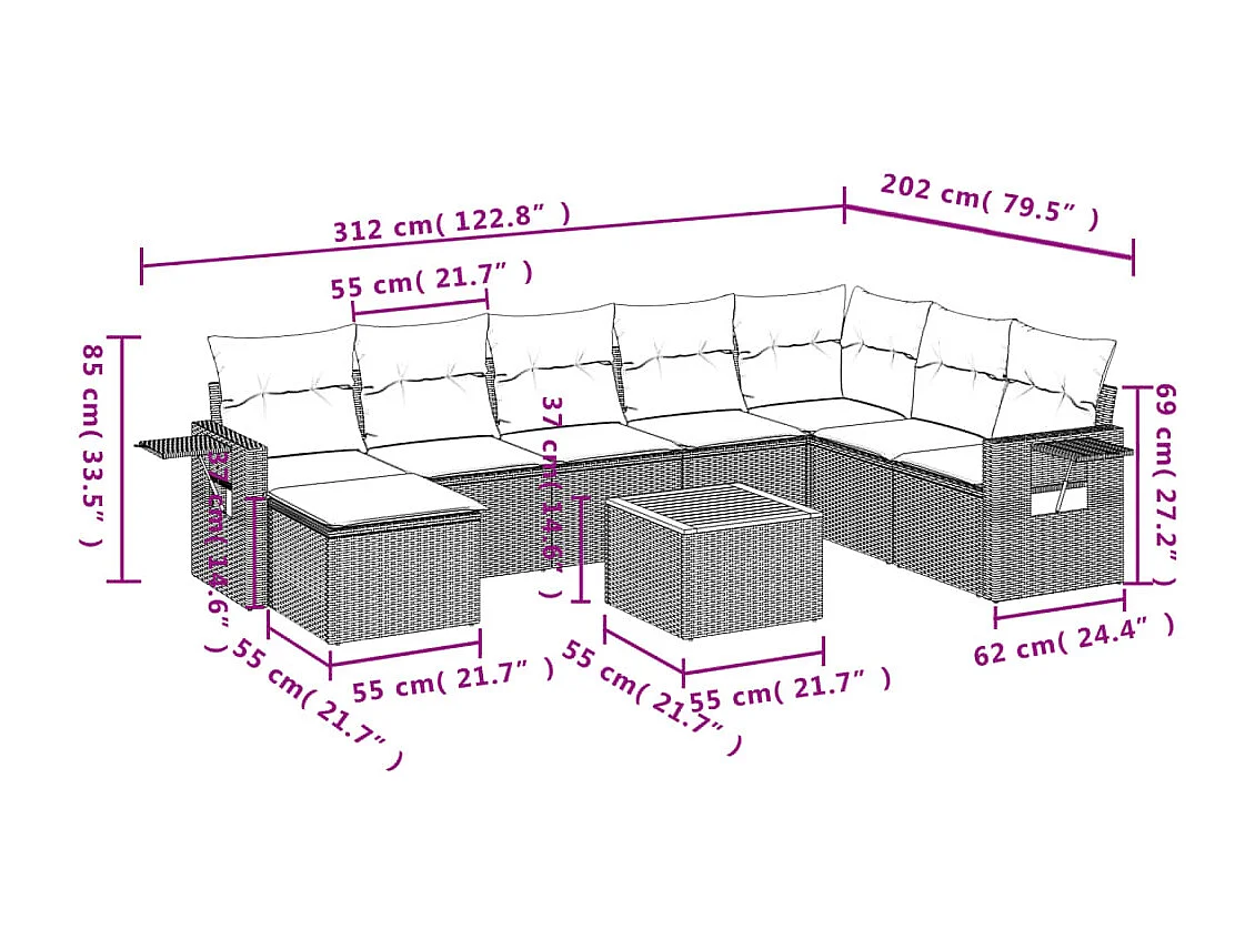 Salon de jardin 9 pcs avec coussins noir résine tressée