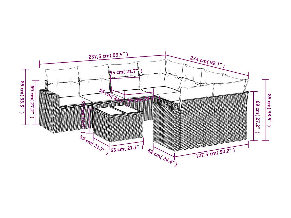Salon de jardin 9 pcs avec coussins noir résine tressée