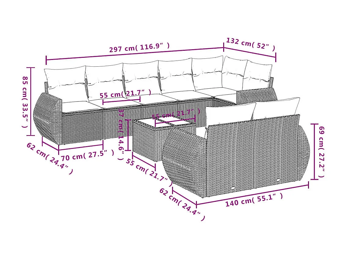 Salon de jardin 9 pcs avec coussins noir résine tressée