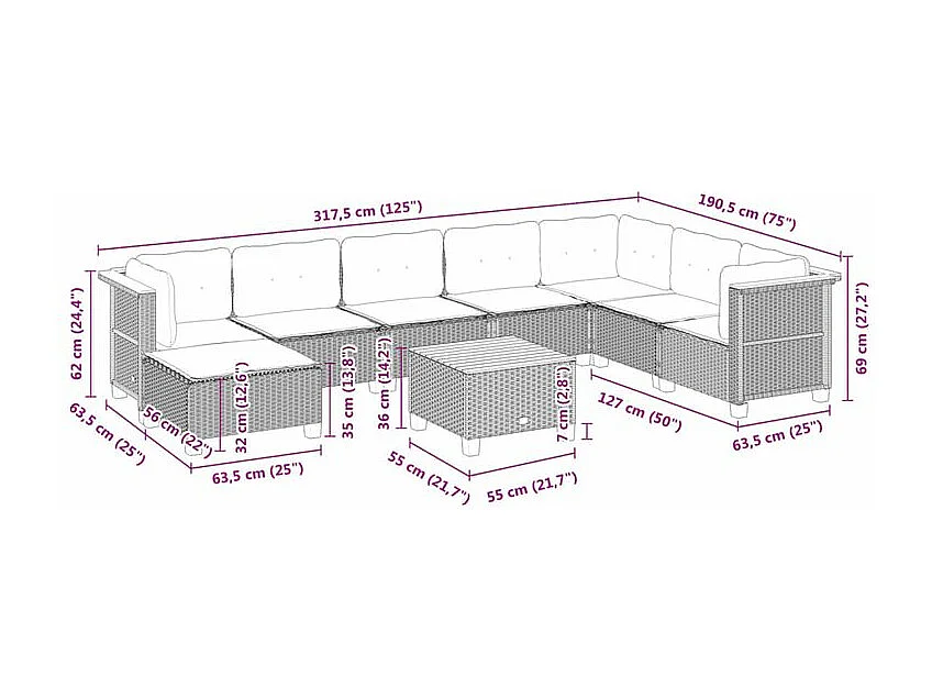 Salon de jardin 9 pcs avec coussins noir résine tressée