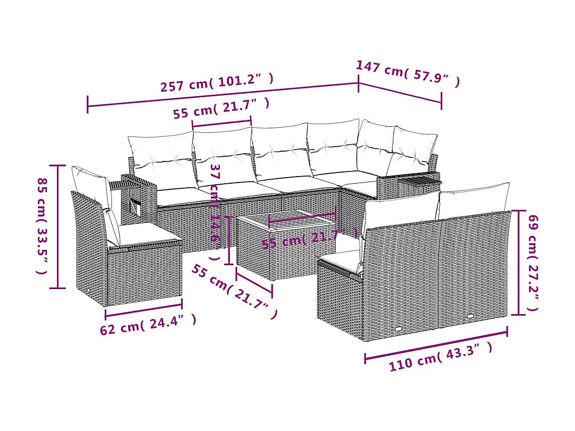 Salon de jardin 9 pcs avec coussins noir résine tressée