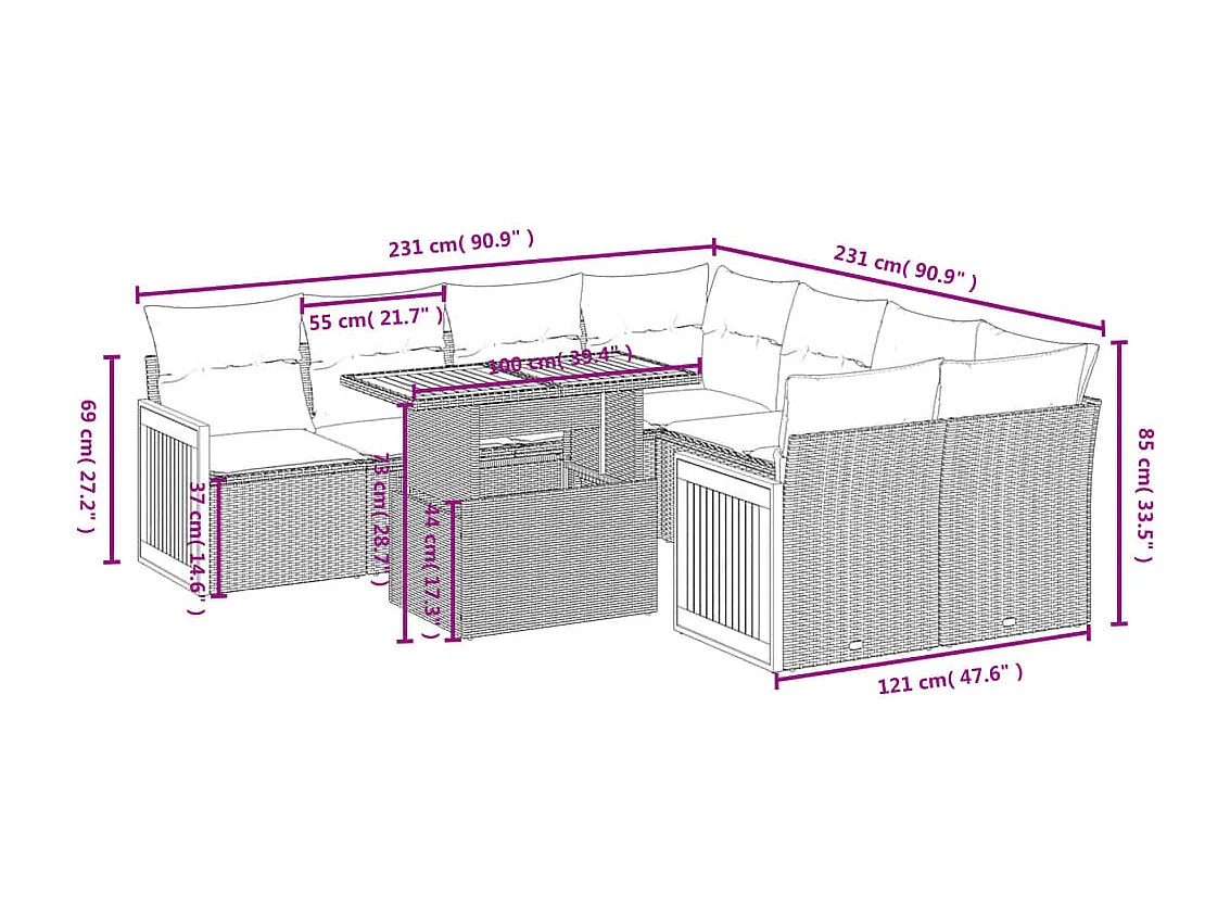 Salon de jardin 9 pcs avec coussins noir résine tressée