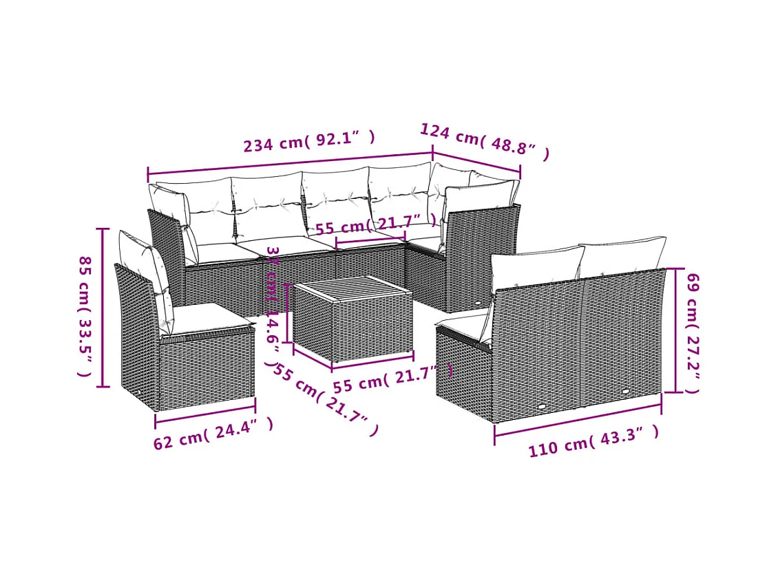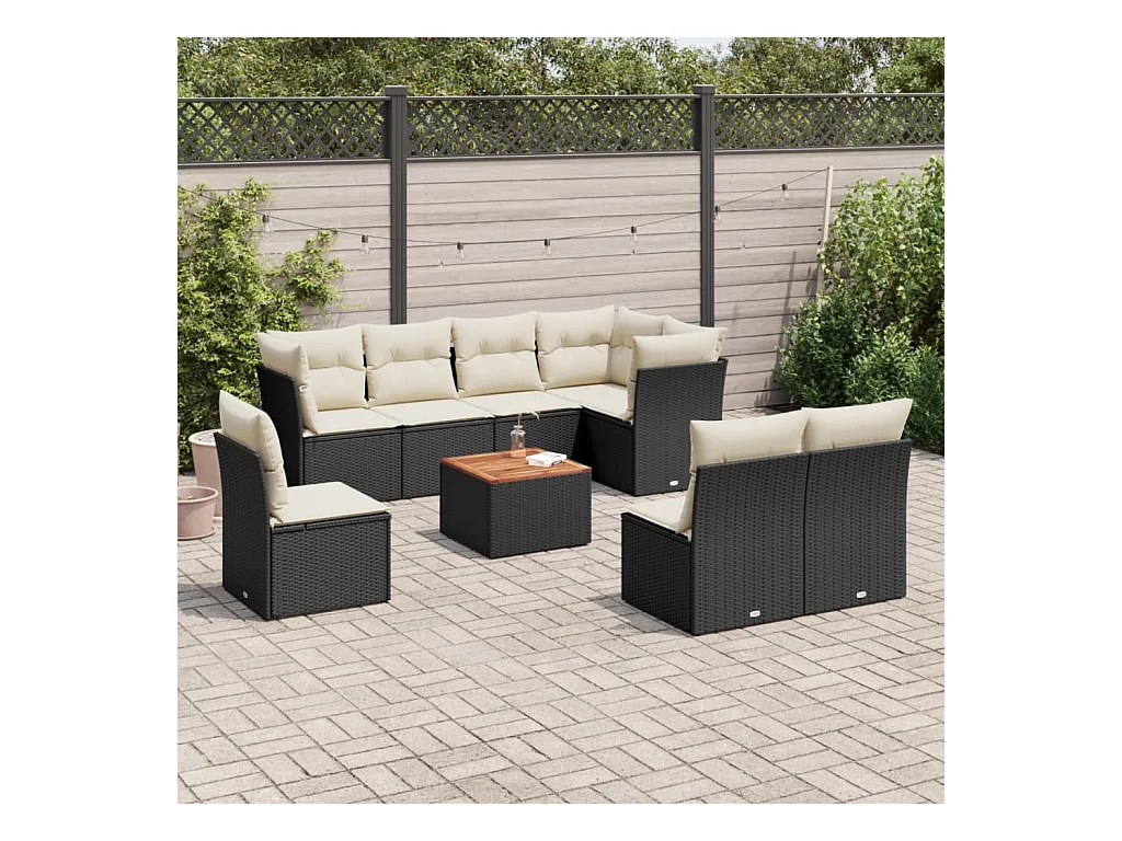 Salon de jardin 9 pcs avec coussins noir résine tressée