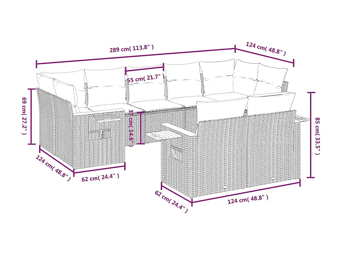 Salon de jardin 9 pcs avec coussins noir résine tressée
