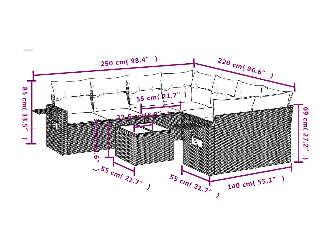 Salon de jardin 9 pcs avec coussins noir résine tressée