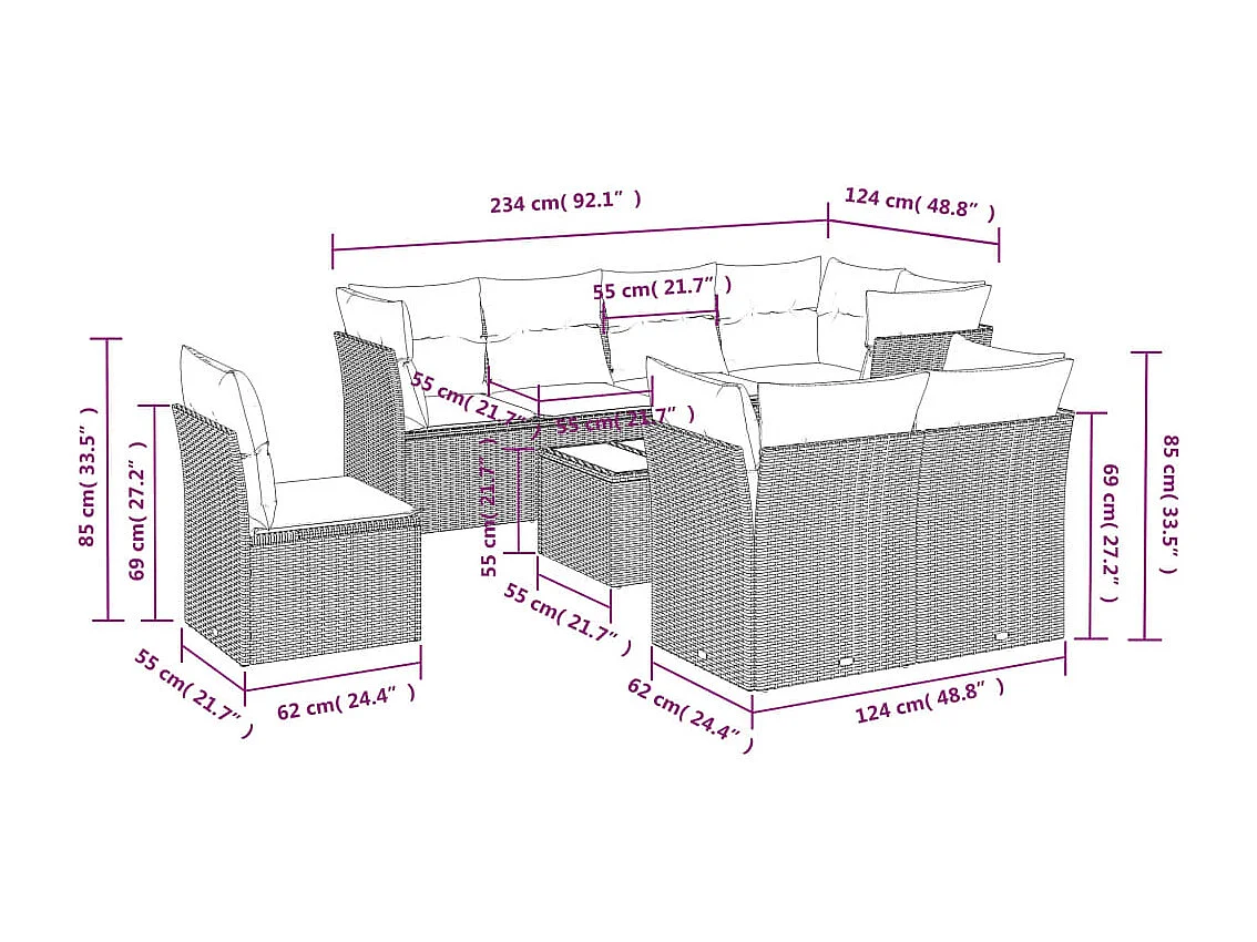 Salon de jardin 9 pcs avec coussins noir résine tressée