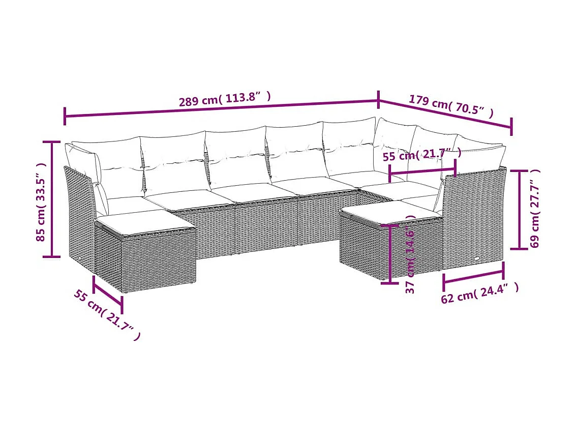 Salon de jardin 9 pcs avec coussins noir résine tressée