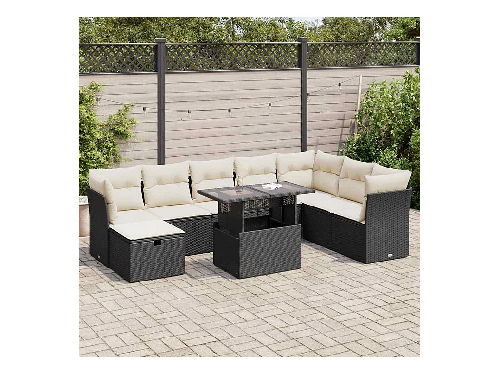 Salon de jardin 9 pièces avec coussins noir résine tressée