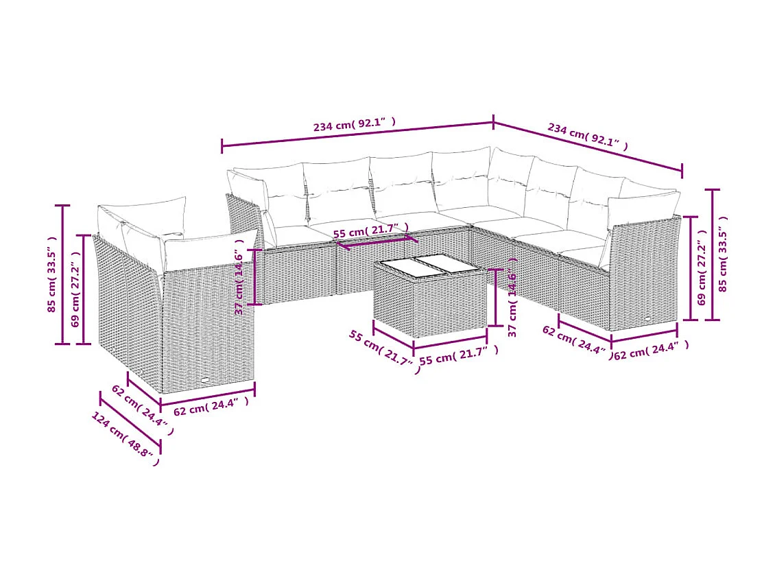 Salon de jardin avec coussins 10 pcs beige résine tressée