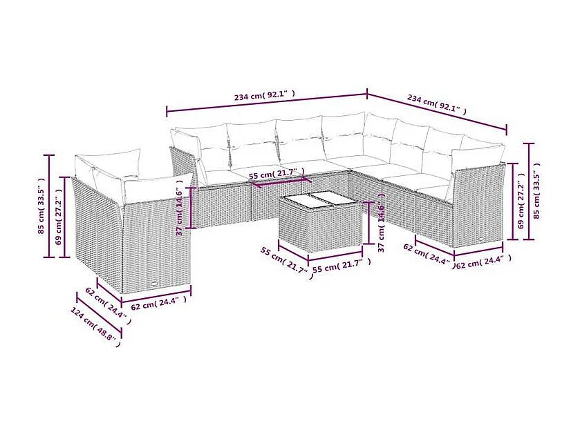 Salon de jardin avec coussins 10 pcs gris clair résine tressée