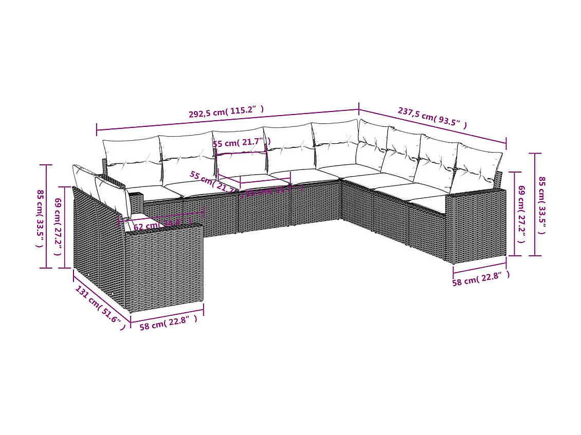 Salon de jardin avec coussins 10 pcs gris clair résine tressée