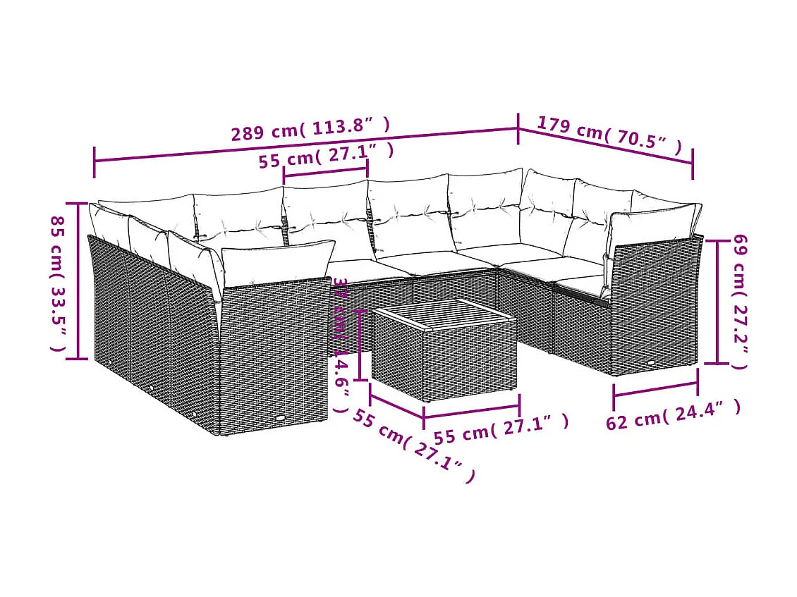 Salon de jardin avec coussins 10 pcs gris résine tressée