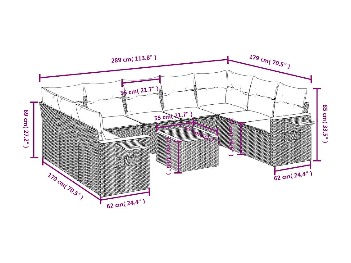 Salon de jardin avec coussins 10 pcs gris résine tressée