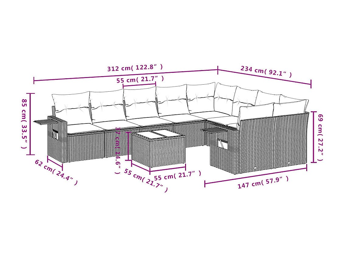Salon de jardin avec coussins 10 pcs gris résine tressée
