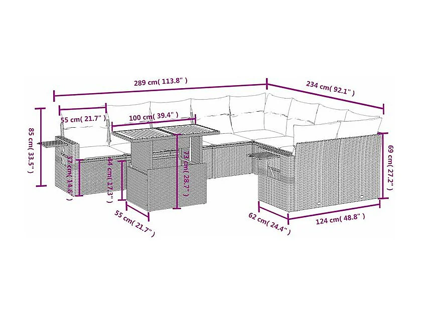 Salon de jardin avec coussins 10 pcs gris résine tressée