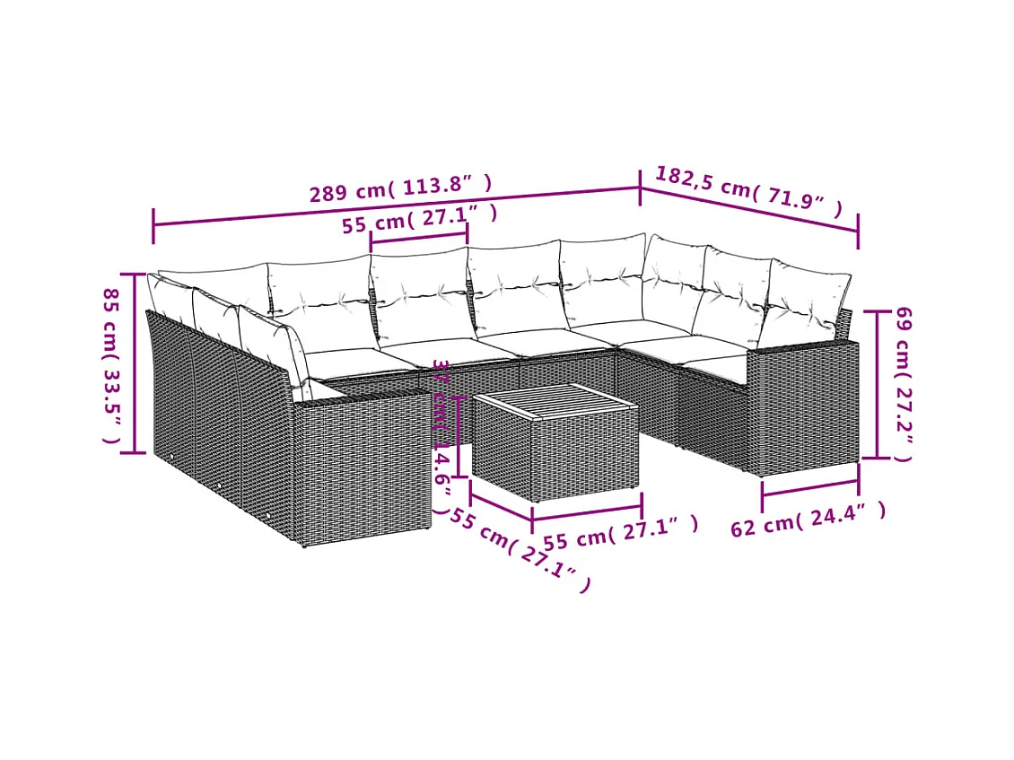 Salon de jardin avec coussins 10 pcs gris résine tressée