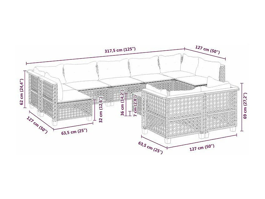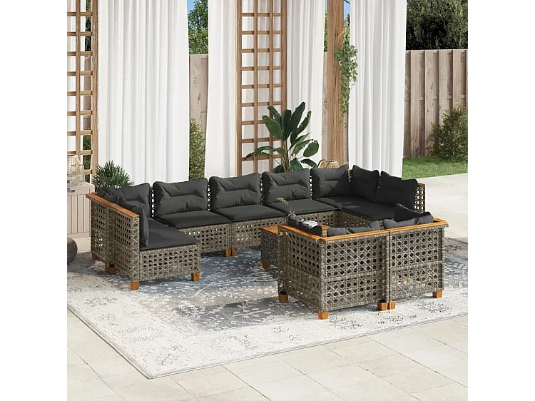Salon de jardin avec coussins 10 pcs gris résine tressée