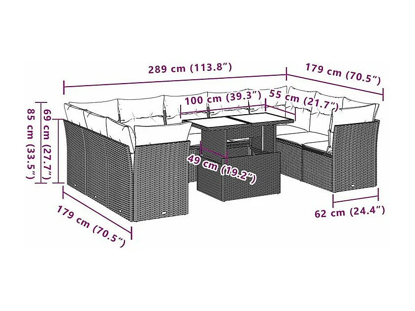 Salon de jardin avec coussins 10 pcs gris résine tressée