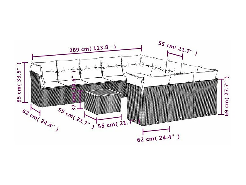 Salon de jardin avec coussins 12 pcs gris résine tressée