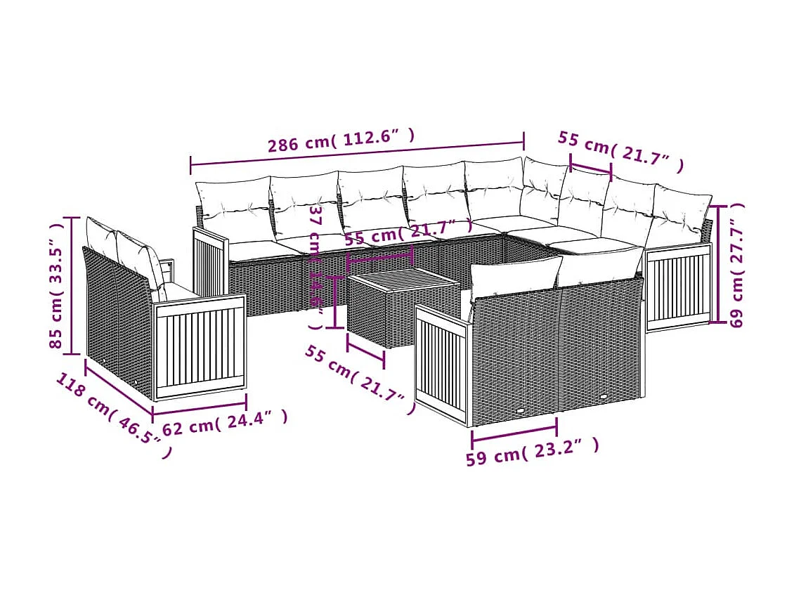Salon de jardin avec coussins 13 pcs noir résine tressée