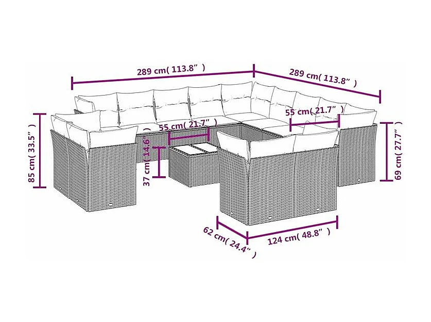 Salon de jardin avec coussins 14 pcs gris clair résine tressée