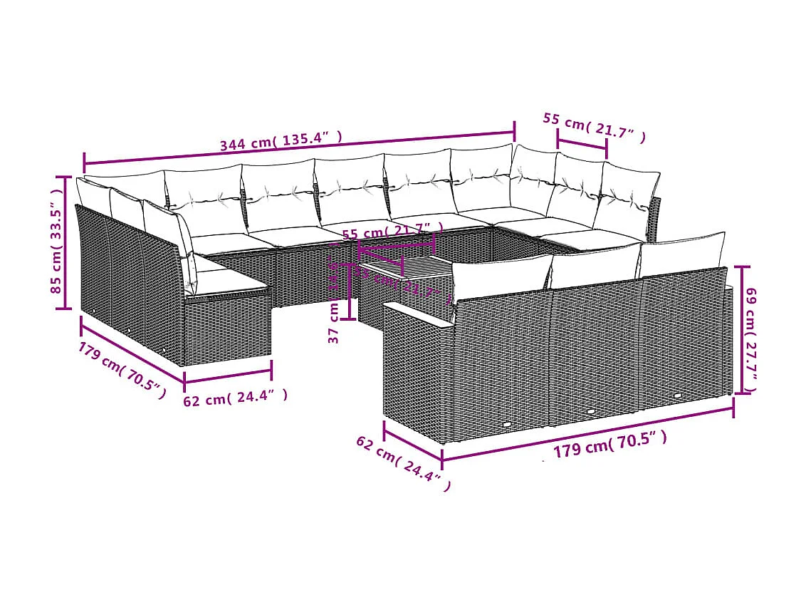 Salon de jardin avec coussins 14 pcs gris résine tressée