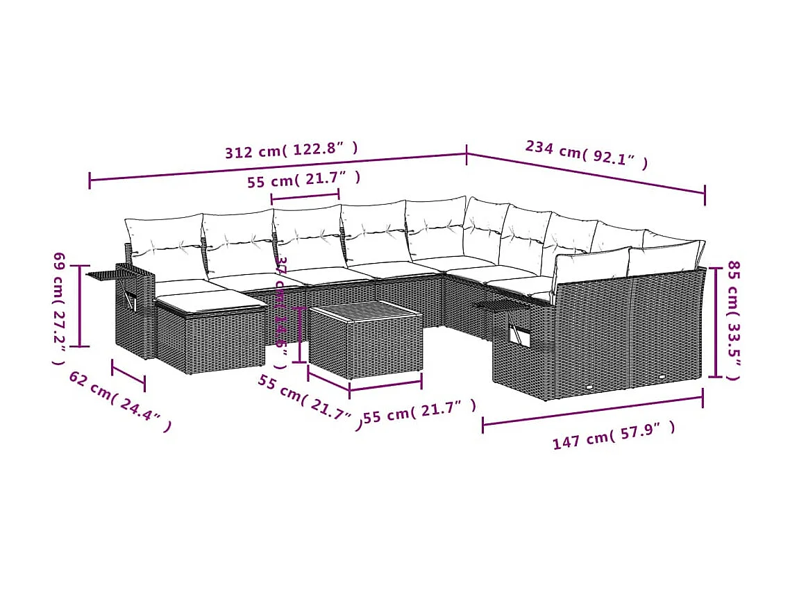 Salon de jardin avec coussins 14 pcs noir résine tressée