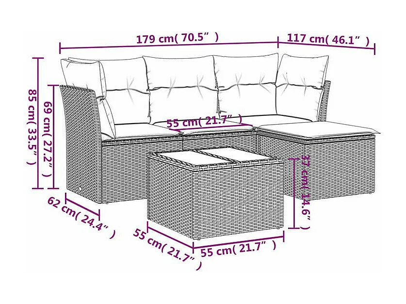 Salon de jardin avec coussins 5 pcs marron résine tressée