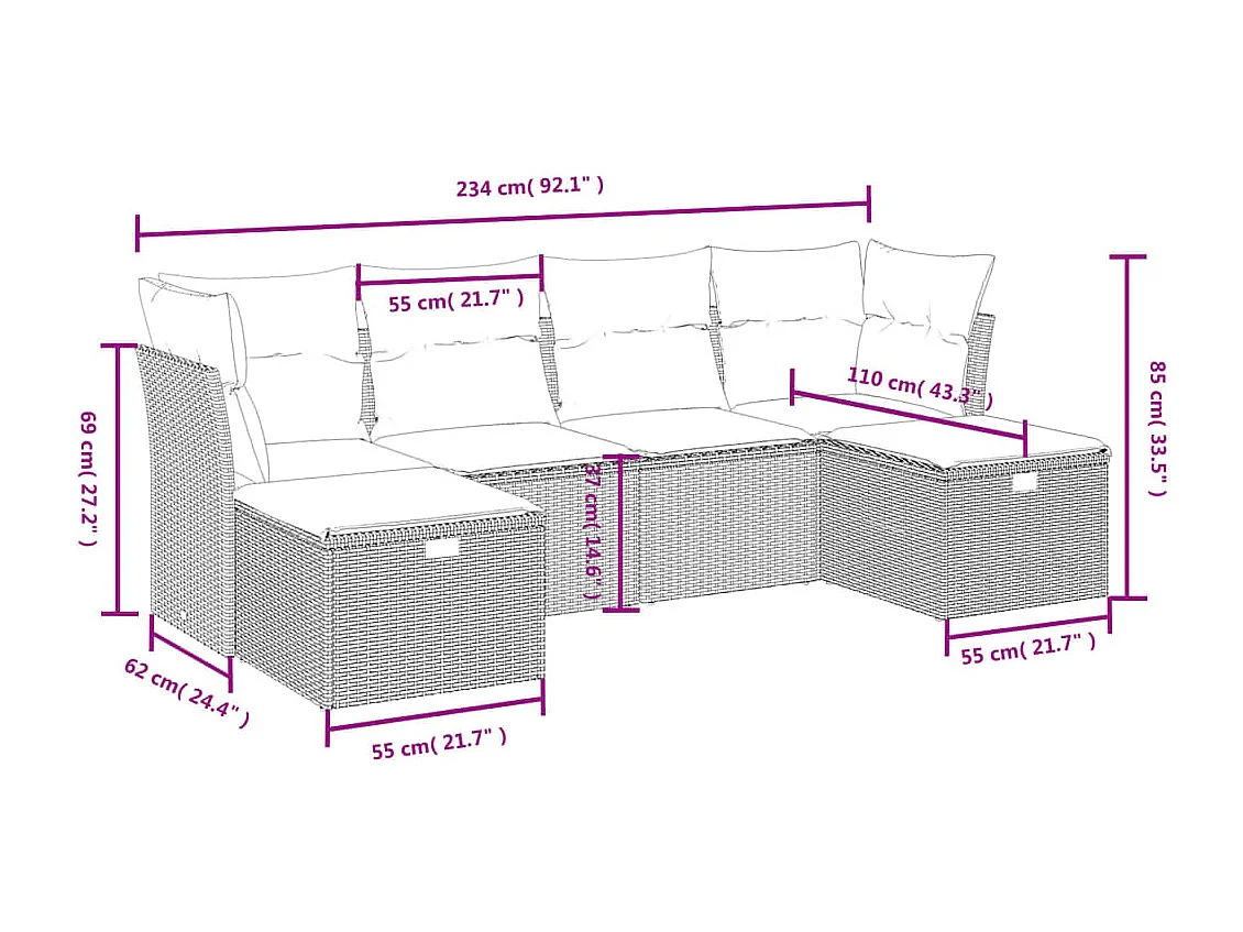 Salon de jardin avec coussins 6 pcs marron résine tressée