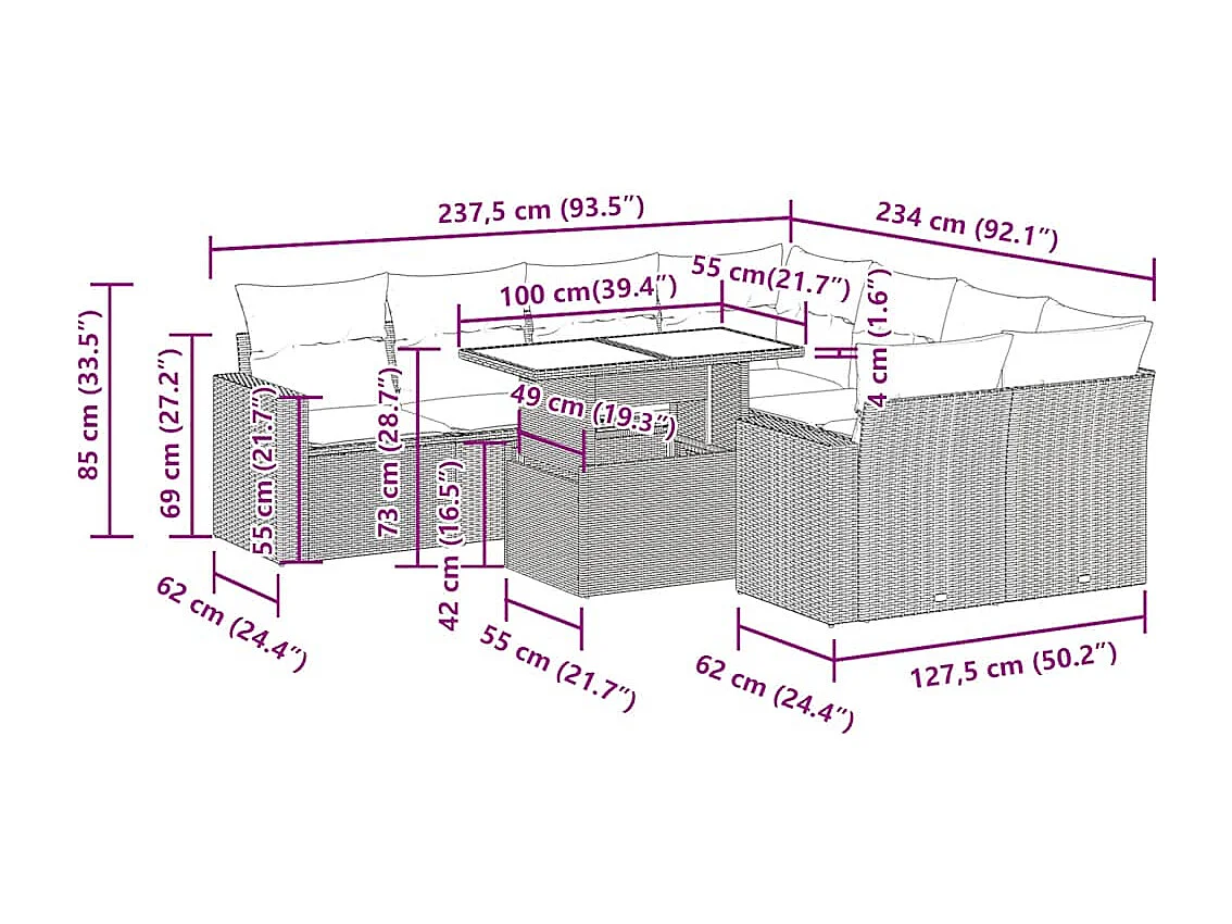 Salon de jardin avec coussins 9 pcs beige résine tressée