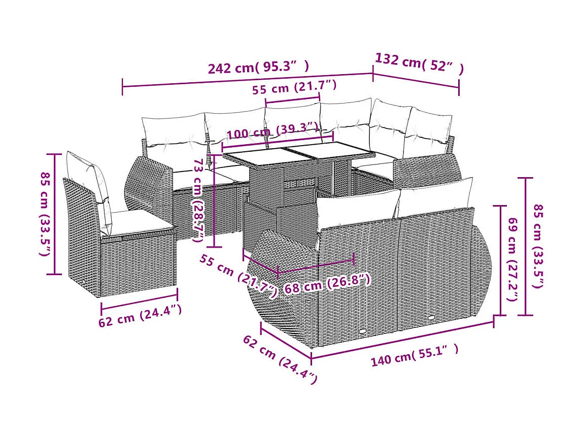 Salon de jardin avec coussins 9 pcs beige résine tressée