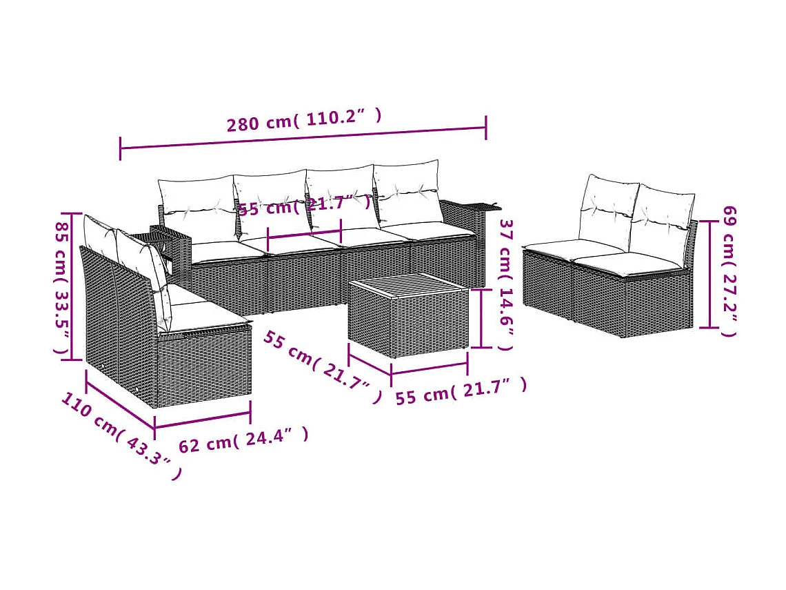 Salon de jardin avec coussins 9 pcs beige résine tressée