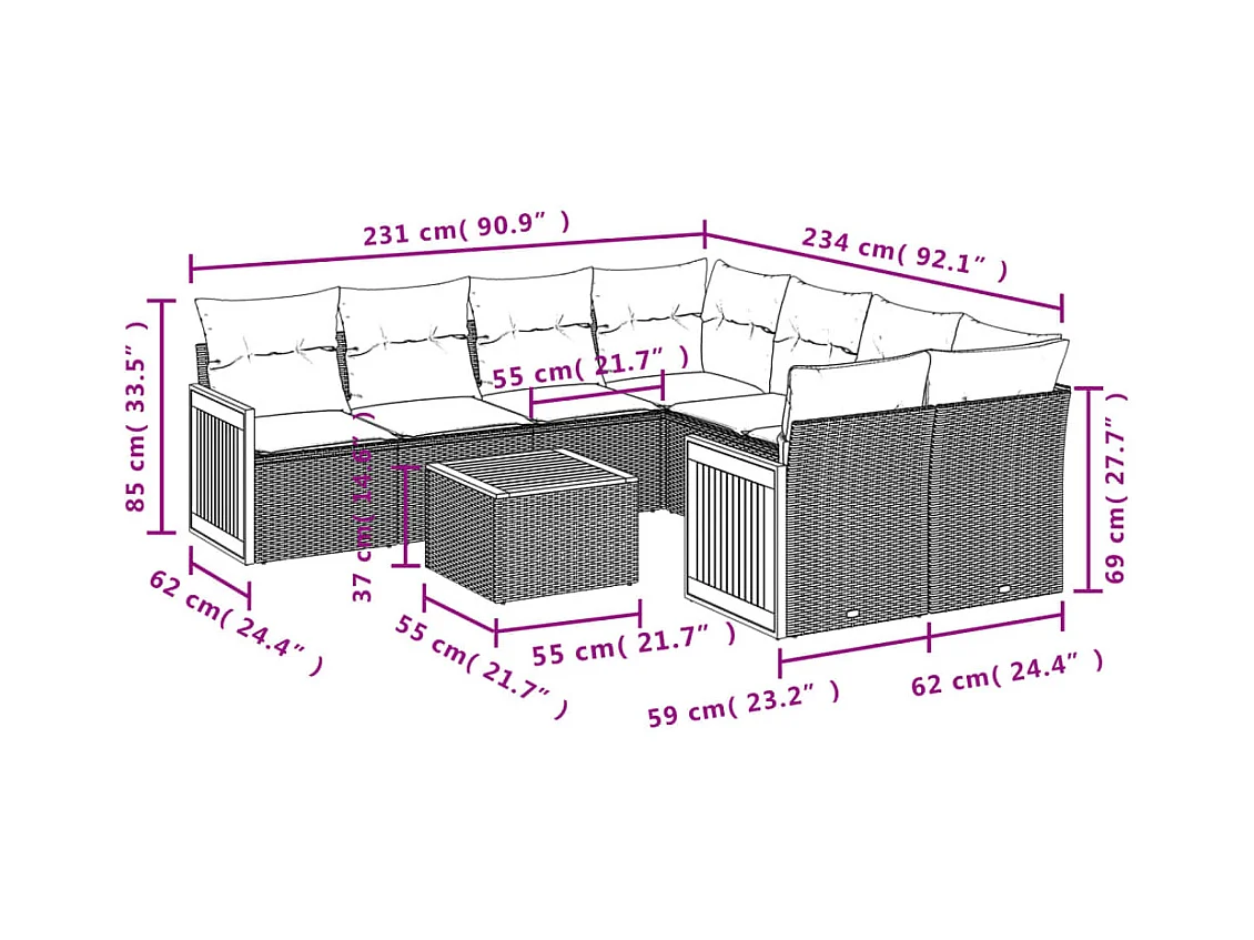 Salon de jardin avec coussins 9 pcs beige résine tressée