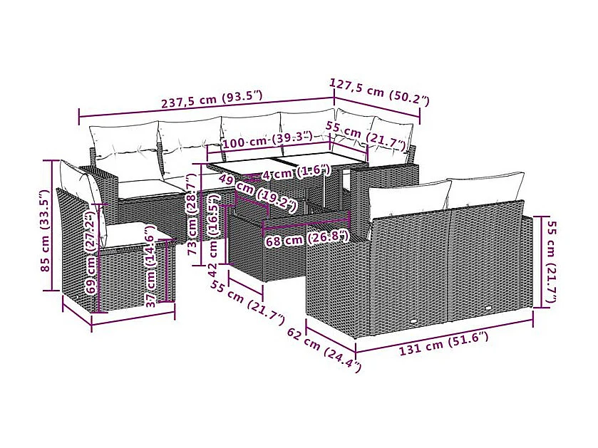 Salon de jardin avec coussins 9 pcs marron résine tressée