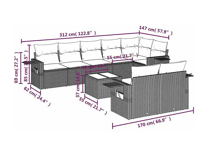 Salon de jardin avec coussins 9 pcs marron résine tressée