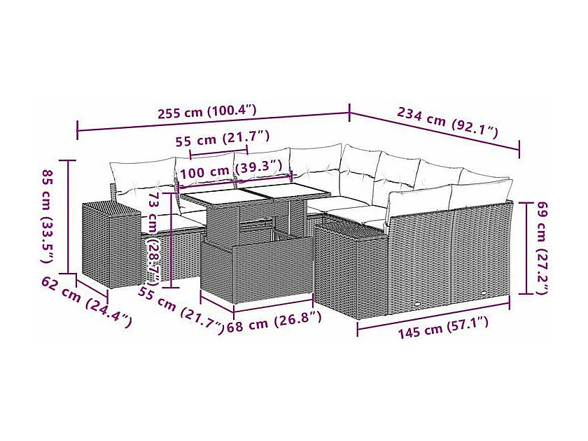 Salon de jardin avec coussins 9 pcs marron résine tressée