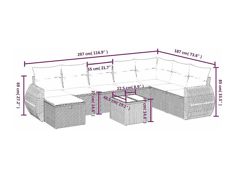 Salon de jardin avec coussins 9 pcs marron résine tressée