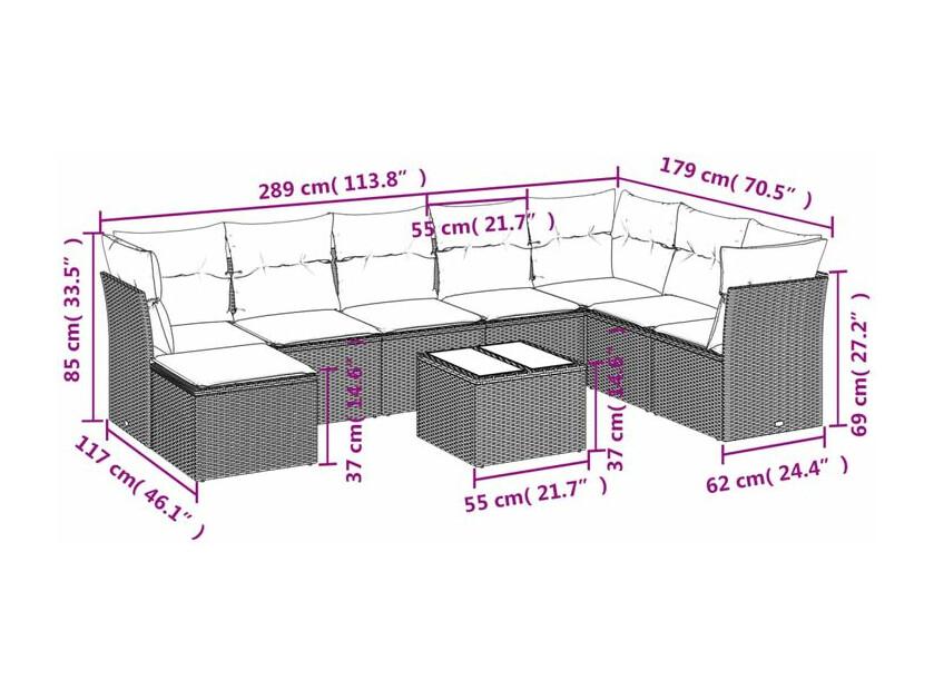 Salon de jardin avec coussins 9 pcs marron résine tressée