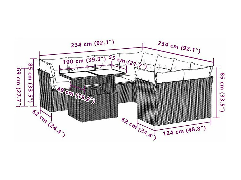 Salon de jardin avec coussins 9 pcs marron résine tressée