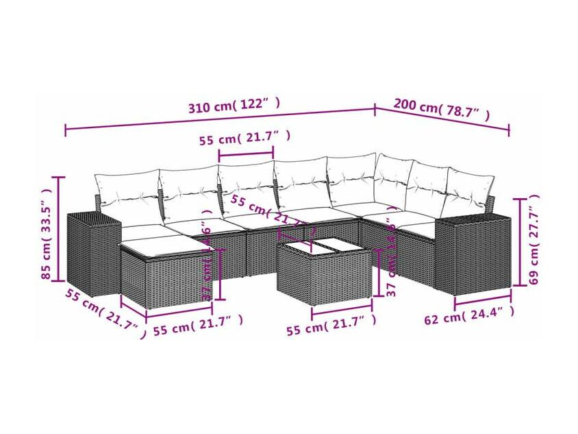 Salon de jardin avec coussins 9 pcs marron résine tressée