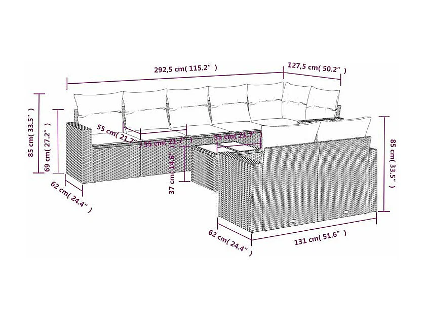 Salon de jardin avec coussins 9 pcs marron résine tressée