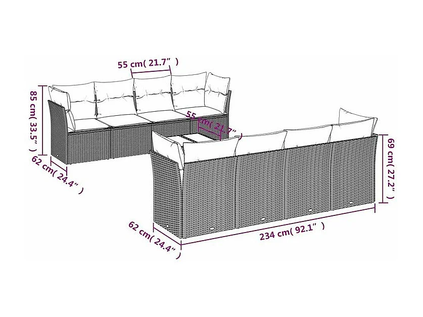 Salon de jardin avec coussins 9 pcs marron résine tressée
