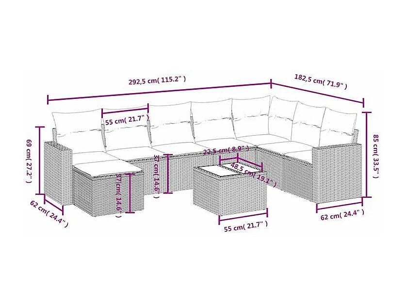 Salon de jardin avec coussins 9 pcs marron résine tressée