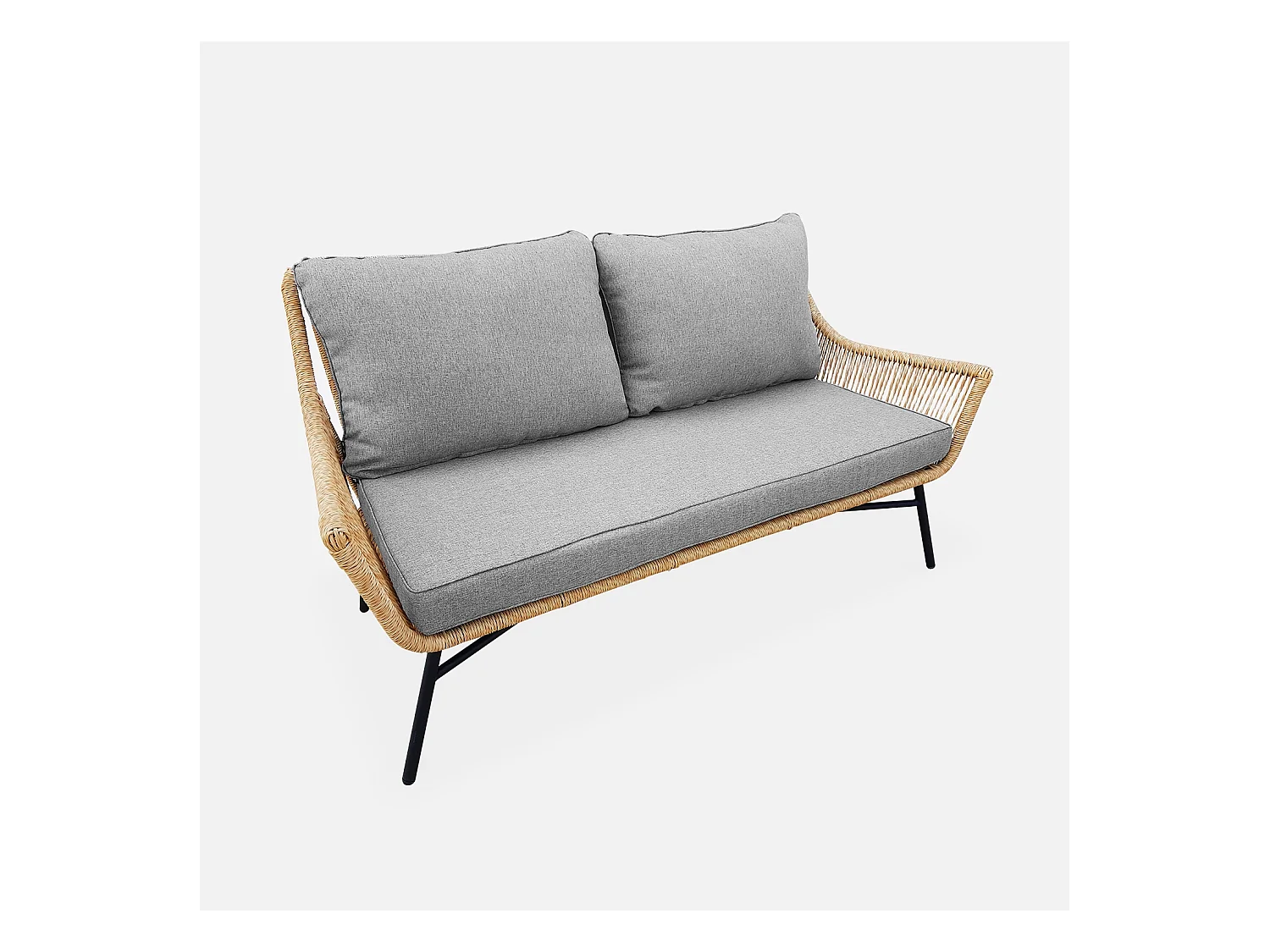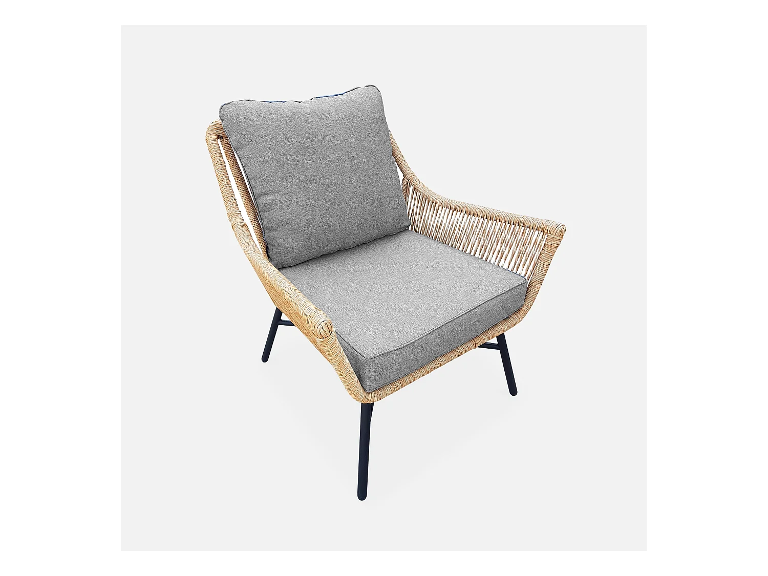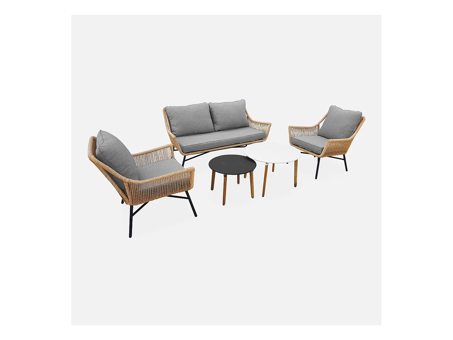 Salon de jardin bas 4 places KUTA – Ensemble canapé 2 places et 2 fauteuils avec 2 tables gigognes. résine tressée effet corde. coussins gris clair chiné