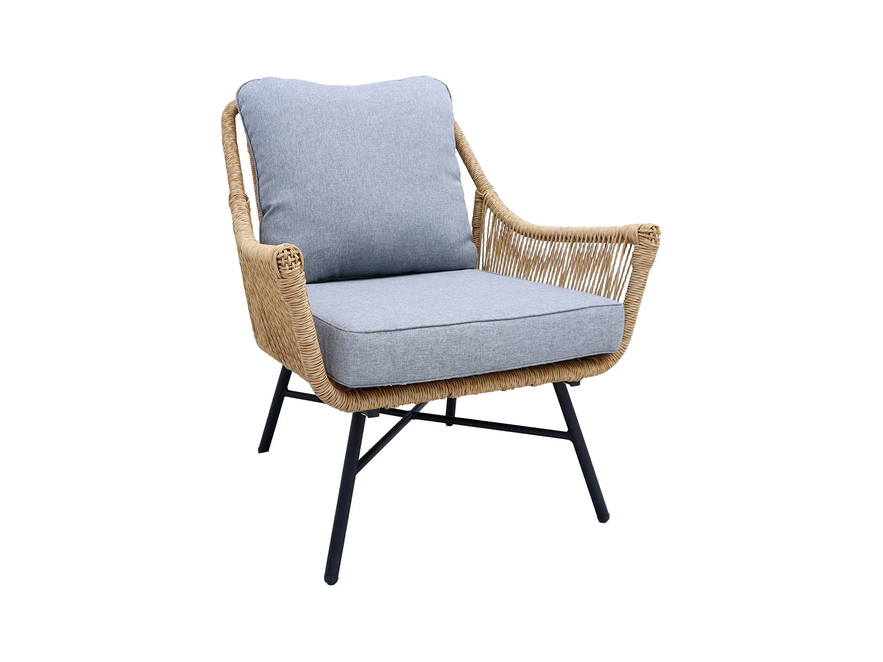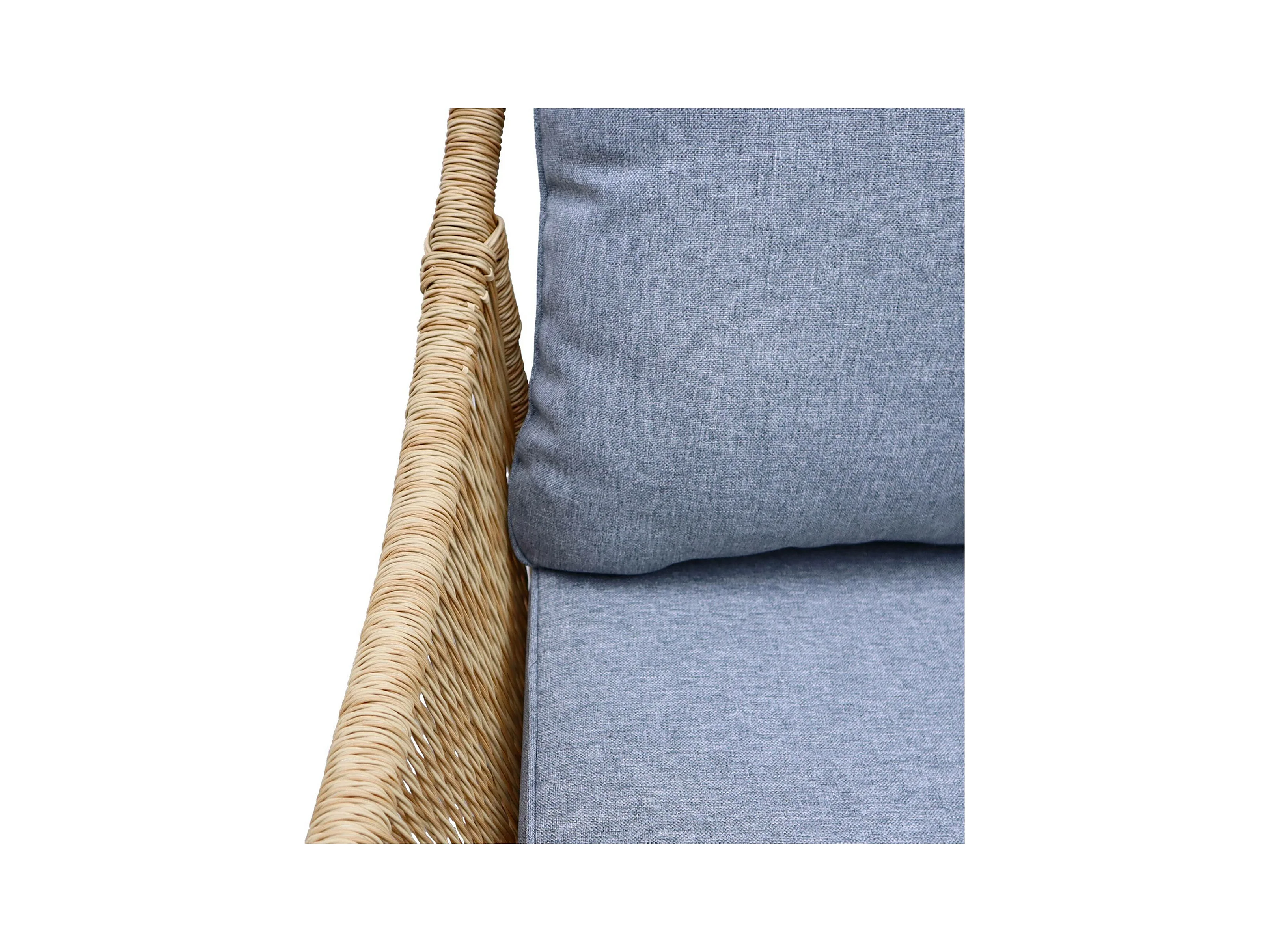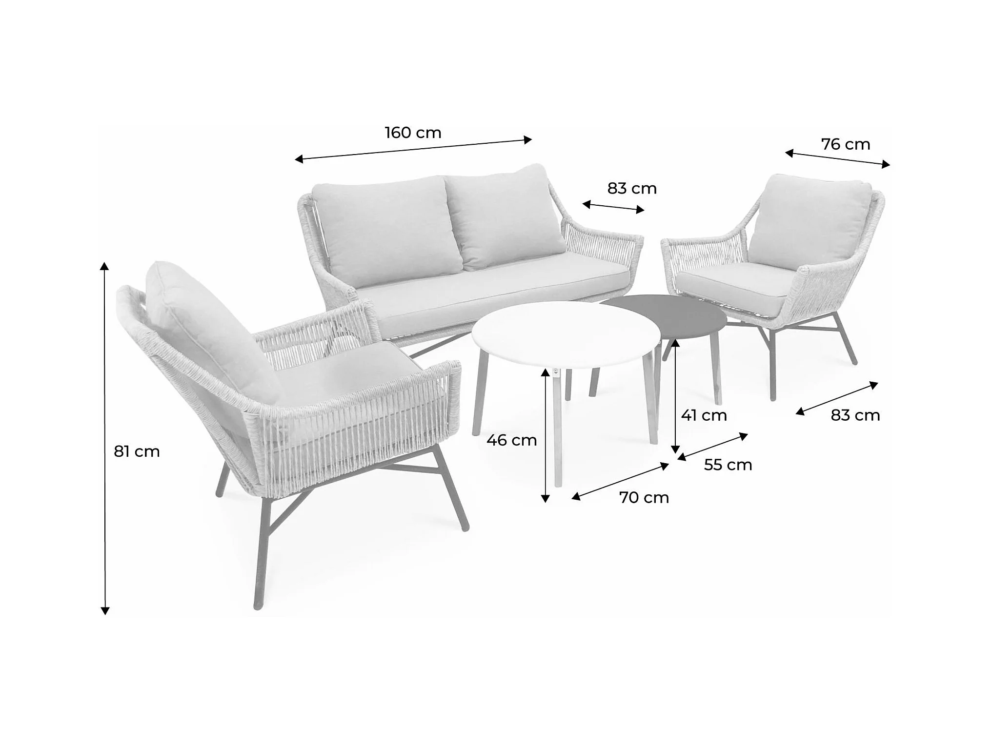 Salon de jardin bas 4 places KUTA – Ensemble canapé 2 places et 2 fauteuils avec 2 tables gigognes. résine tressée effet corde. coussins gris clair chiné
