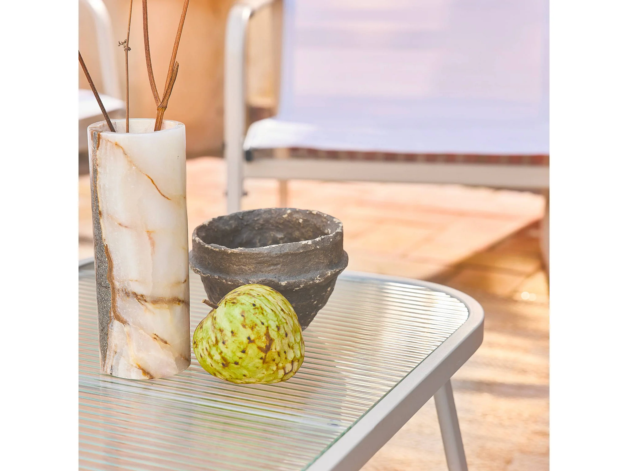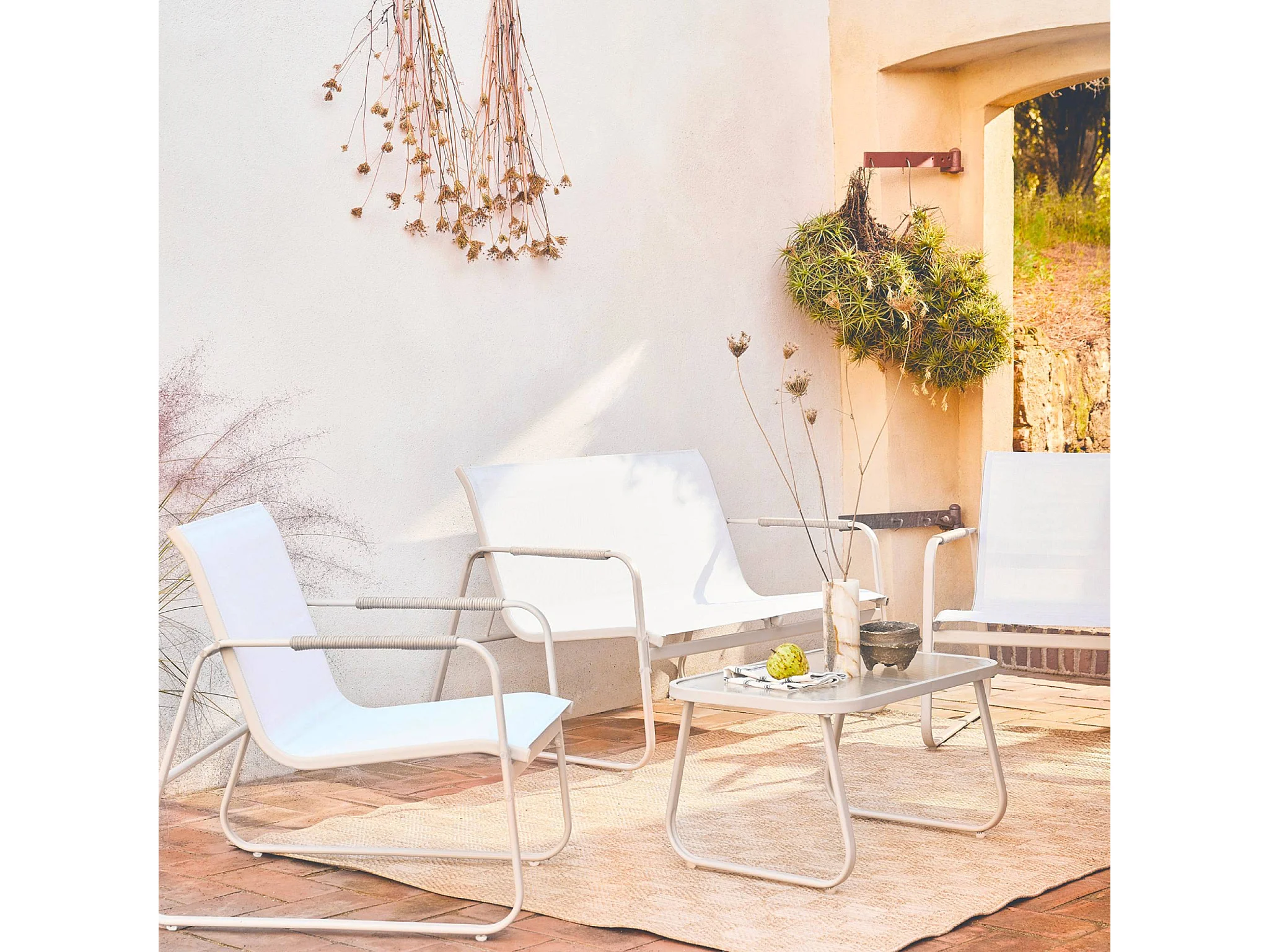 Salon de jardin blanc NOTO acier. 4 places. un canapé. une table. deux fauteuils textilene