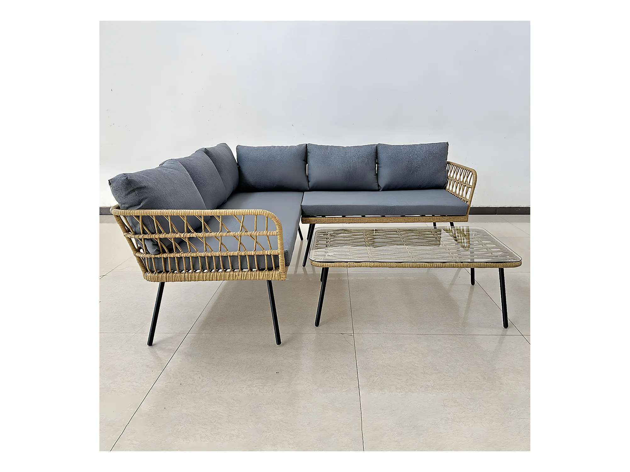 Salon de Jardin Canapé d'Angle, Table Basse - Marron, Coussins Gris